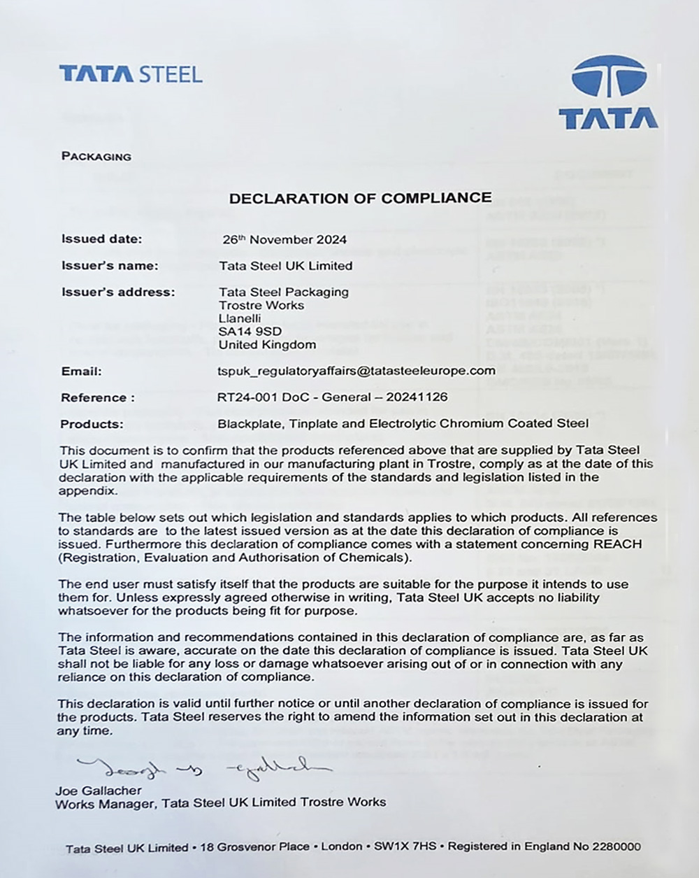 Certificate of Conformity for our steel